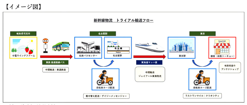 中電ウイング株式会社が、岐阜県可児市の中電ウイングファームから東京都内幸町にあるアンテナショップ「岐阜トーキョー」に商品をお届けする手段として、東濃鉄道の高速路線バス貨客混載輸送、ジェイアール東海物流の新幹線輸送(東海道マッハ便)、自転車カーゴバイク配送を組み合わせたモーダルシフト・トライアル輸送を8 月27 日(水)に実施しました。