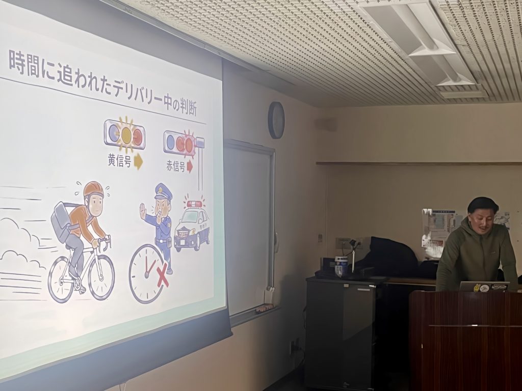 その上で、クリオシティのメッセンジャーにとって重要な考え方として、“他者への配慮”というキーワードを紹介。急いでいるのは私たちだけではなく、他の交通や歩行者に配慮が行き届いているライディングにこそプロ意識が宿るということを、メンバー全員で共有しました。
