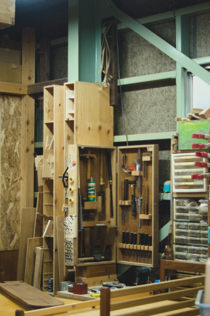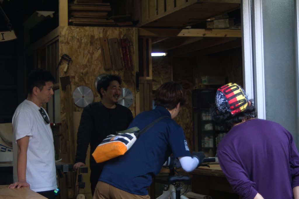 そのあとはキャンプ場に向かう前に“decci工房”へ。ここはクリオシティが取り組む「クラフト・カーゴバイク・マルシェ」プロジェクトでカーゴバイクに取り付ける什器の制作を依頼している工房で、木工家具職人・藤さんの作品を見ながらしばし談笑。なんて寄り道をしているとあっという間にキャンプ場のチェックイン時間となり、急いでキャンプ場へ向かいました。