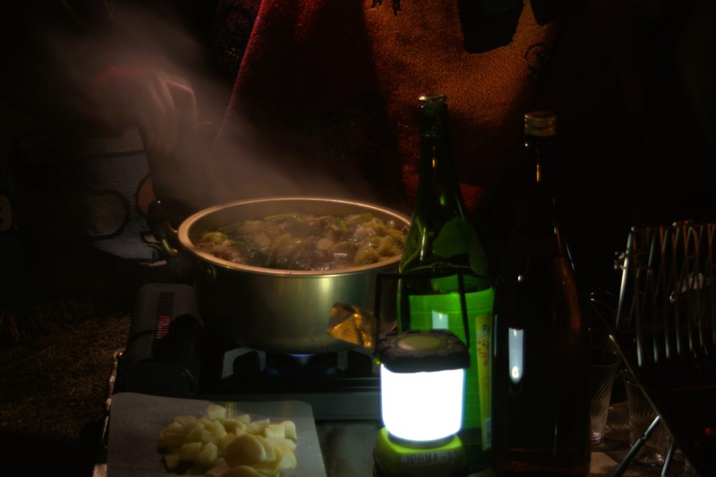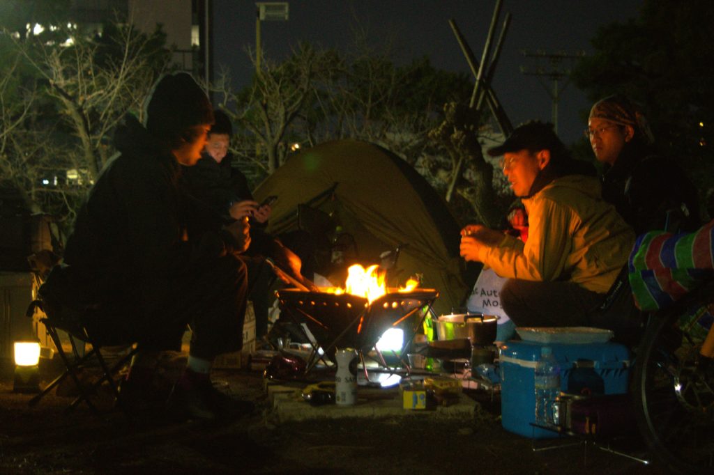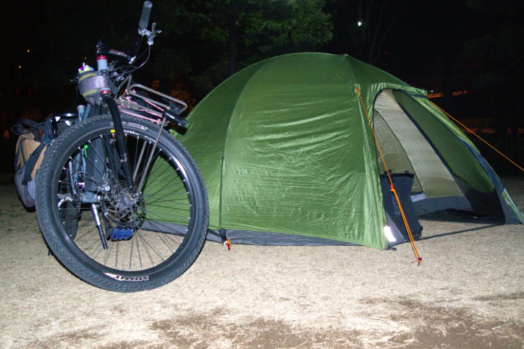 平和島公園キャンプ場は1区画が広く、自転車を持ち込めるため、「カーゴバイクとテント」の画角を見事に再現できる素晴らしい場所。炊事場があり、道具を用意すれば焚き火も可能で、公園のすぐそばにスーパーや温泉もあって便利でした。夜はキンと冷えた空気の中、もつ鍋とお酒で乾杯。熱々のもつやキャベツがまた旨いのなんので、サイコーの夜でしたね。